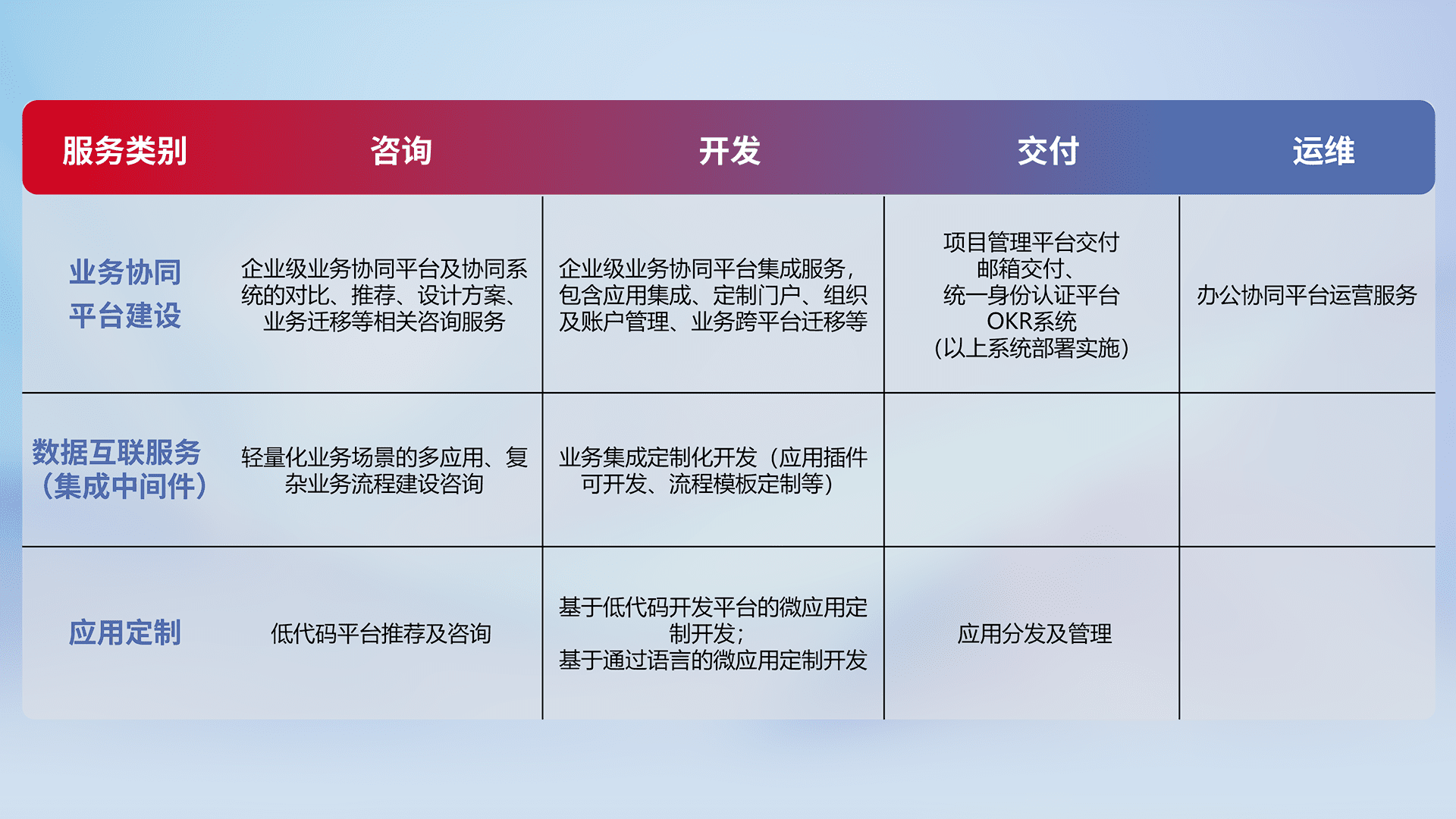 针对钉钉、、、企微、、、、IDaas等平台级产品提供产品的规划、、方案、、、、交付、、定制化开发等服务,,,,实现如统一协同办公、、、智能客户服务、、、、混合会议管理、、智能数据查询、、、、等业务场景,,,,实现数字化转型。。。。