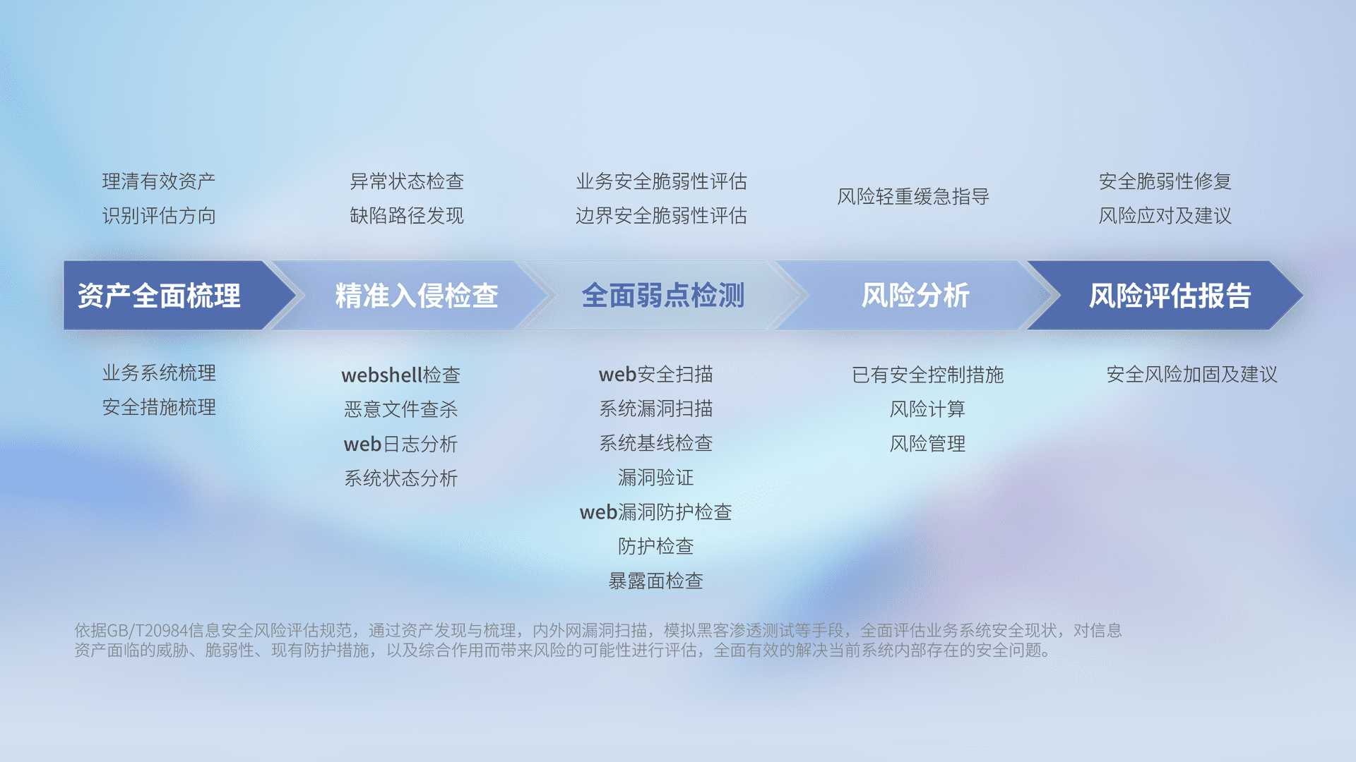 针对客户行业特性,,,以专业的安全服务+多厂商联合解决方案提供专属的一站式安全管理服务,,,帮助客户全面感知网络空间威胁,,,,基于识别、、检测、、、、分析、、防护、、监测、、响应的服务理论模型,,,从方案咨询、、集成交付、、、评估验证、、优化加固、、、、运维运营,,,致力于为客户提供完整的闭环管理式安全服务。。。以实战经验为客户打造高抵御风险的安全体系,,,,帮助客户发现威胁、、、、对抗威胁、、、、处置威胁,,,,不断积累安全对抗能力,,持续保障数字化安全。。。